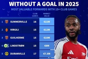 體育資訊1月4日訊 2025年已經過去,多位知名前鋒一整年均未能取得進球,《轉會市場》也統計了在俱樂部出場15+但0進球的球員身價榜。