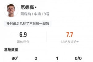 體育資訊1月4日訊 英超第20輪,阿森納客戰(zhàn)伯恩茅斯。厄德高首發(fā)出戰(zhàn),送出1次助攻,1次關(guān)鍵傳球,還有3次搶斷,評分6.9。