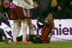 英超第20輪,阿森納客場(chǎng)3-2逆轉(zhuǎn)伯恩茅斯。比賽第95分鐘,伯恩茅斯前鋒阿明·阿德利從側(cè)后方一頭撞向加布里埃爾肘部,隨后倒地捂臉,坐在地上向主裁投訴加布肘擊,但主裁并無(wú)表示。