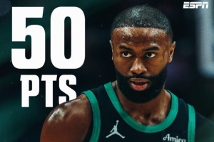 “杰倫·布朗狂轟50分,平個人單場得分紀錄,成為伯德和塔圖姆之后第三位多次砍下50+的綠軍球員,他也是本賽季第10位50+先生。
