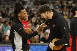 賽前,馬刺后衛(wèi)卡斯爾和開拓者內(nèi)線克林根被拍到在場邊嬉戲玩耍。