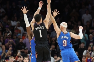 比賽最后時(shí)刻,布克迎著卡魯索的防守三分絕殺。對(duì)此,后者在接受采訪時(shí)說(shuō)道:“你不能在比賽中讓一位全明星級(jí)別、NBA最佳陣容級(jí)別的球員有機(jī)會(huì)去贏得比賽。”