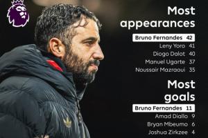 體育資訊01月05日訊 在阿莫林下課后,英超官方曬出了阿莫林執教期間,曼聯球員的各項數據,B費在出場數、進球數、助攻數上都是最多的。