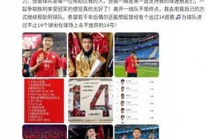 從全運會小將到今天的老將,很幸運職業生涯能一直在上海海港這么棒的俱樂部效力,感謝球隊里每一位幫助過我的人,感謝一路走來一直支持我的球迷朋友們,一起爭取勝利享受冠軍的感覺真的太好了!離開一線隊不是終點,我會用我自己的方式繼續幫助到球隊。希望若干年后偶爾還能想起曾經有個出過14首歌??為球隊進過不止14個球??在球場上永不放棄的14號!