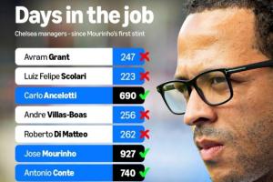 近13位切爾西正式主帥中,超過半數未能執教滿1年,穆里尼奧是這期間在任時長最久的主帥。