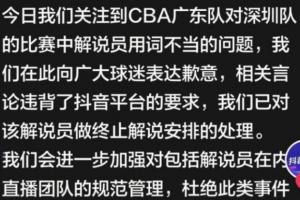 抖音體育官方隨后發(fā)文致歉:今日我們關(guān)注到CBA廣東隊(duì)對深圳隊(duì)的比賽中解說員用詞不當(dāng)?shù)膯栴},我們在此向廣大球迷表達(dá)歉意,相關(guān)言論違背了抖音平臺的要求,我們已對該解說員做終止解說安排的處理。我們會進(jìn)一步加強(qiáng)對包括解說員在內(nèi)直播團(tuán)隊(duì)的規(guī)范管理,杜絕此類事件再次發(fā)生,不斷提升賽事轉(zhuǎn)播的質(zhì)量,為球迷帶來更好的服務(wù)和體驗(yàn)。