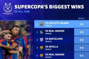 體育資訊1月8日訊 西超杯半決賽,巴薩5-0大勝畢爾巴鄂競技。德國轉會市場統計了西超杯歷史最大比分勝利,并列出榜單,巴薩5-0畢巴居首。