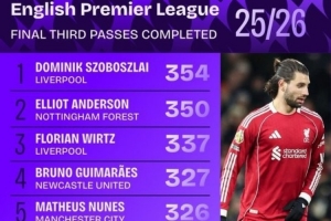 本賽季英超進攻三區成功傳球榜: