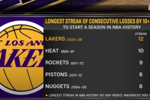 備注:在賽季任何時段,連續輸兩位數紀錄是1992-93賽季的小牛(21場)