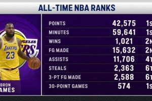 湖人主場迎戰雄鹿,轉播方曬出詹姆斯各項紀錄: