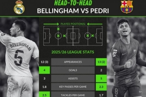 貝林厄姆:12首發、3替補,4球、3助攻,1.8關鍵傳球、2.5搶斷、1.3過人,傳球成功率89.6%,獲評7.44分