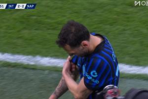 體育資訊01月12日訊 國米vs那不勒斯第87分鐘,恰爾汗奧盧無法堅持坐地上了,之后他下場,蘇契奇登場!