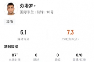 體育資訊1月12日訊 國米在本輪意甲對陣那不勒斯,勞塔羅本場數據如下: