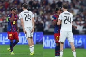 巴薩在西超杯決賽3-2擊敗皇馬奪冠,這場比賽并非只有溫情,比賽過程中也多次爆發(fā)了緊張的對峙。其中一次沖突的主角是西班牙國家隊的兩位隊友:亞馬爾與赫伊森。