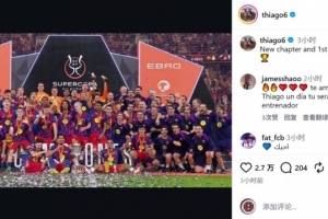 目前擔任巴薩助教的蒂亞戈更新社媒動態,曬出球隊捧杯的大合照,慶祝球隊奪冠,配文:“新的篇章,本賽季首冠?!?/p>