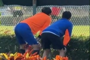 多支中超球隊正在海口備戰新賽季,其中包括山東泰山和青島西海岸,一段視頻顯示,泰山門將王大雷在訓練結束后透過圍欄觀看西海岸訓練。