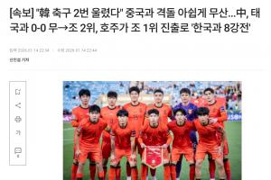 韓媒標(biāo)題為:韓國足球兩度飲恨 與中國對決遺憾落空(中國0-0戰(zhàn)平泰國獲小組第二 澳大利亞頭名晉級將與韓國會師八強(qiáng)戰(zhàn))