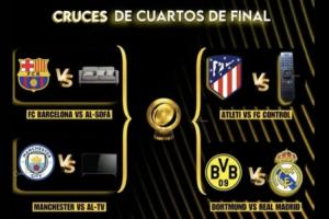 在圖片中有4組對陣,分別是巴薩vs沙發、馬競vs電視遙控器、曼城vs電視機和多特vs皇馬。其中巴薩沒有參加本屆世俱杯,曼城和馬競都已經被淘汰。