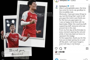 富安健洋與阿森納提前解約,成為自由球員,他在社交媒體上寫道:“在度過了四年難忘的時光后,是時候與這家偉大的俱樂部說再見了。