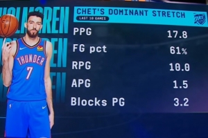 據統計,在最近10場比賽中,霍姆格倫場均可以得到17.8分10籃板1.5助攻3.2蓋帽,投籃命中率高達61%!