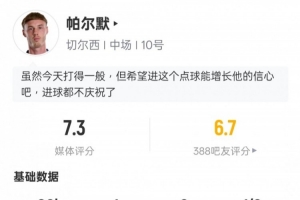 體育資訊1月18日訊 英超第22輪,切爾西2-0布倫特福德。帕爾默首發出戰,打滿全場,打進1粒點球,2次過人成功,2次攔截,評分7.3。