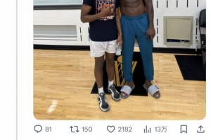 體育資訊7月5日訊 今日,湖人前鋒詹姆斯前往騎士訓(xùn)練館進(jìn)行了訓(xùn)練,并與騎士夏聯(lián)新秀丹佛-瓊斯合影。