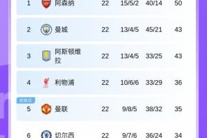 體育資訊1月19日訊 今日英超第22輪,維拉0-1不敵埃弗頓。英超前四——阿森納、曼城、維拉、利物浦,均遭遇連續兩輪不勝,本輪僅曼城、維拉輸球。最新積分榜如下: