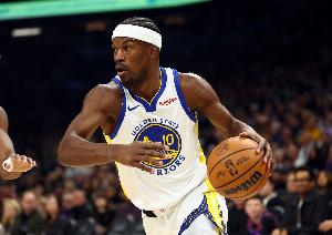 比賽第三節,勇士球星吉米·巴特勒右膝受傷,被隊友架著回到更衣室,隨后退出了本場比賽。