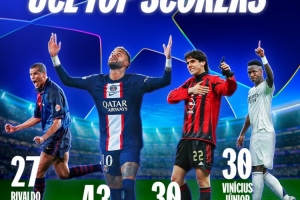 維尼修斯在歐冠中的進球數達到30球,這讓他追平了卡卡并列巴西球員歐冠進球榜次席,位居兩人身前的是打進43球的內馬爾。