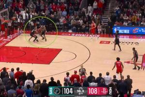 比賽剩最后16秒,馬刺104-108落后火箭4分,杜蘭特被包夾丟球?yàn)醵瓤ê巴#遣门袌?bào)告顯示凱爾登最初與球接觸,然后將手移到了杜蘭特手臂上導(dǎo)致后者失去對(duì)球的控制,這是一個(gè)犯規(guī)裁判漏判。