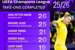 體育資訊1月23日訊 數據機構Squawka統計本賽季歐冠球員成功過人次數榜,海于格26次居首,奧利塞25次第二,亞馬爾21次第三。