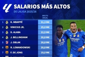 體育資訊1月24日訊 德國轉會市場盤點了本賽季西甲球員年薪情況,姆巴佩以3130萬歐元居首,維尼修斯以2500萬歐元位居次席,前四均為皇馬球員。