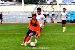 今天下午,在??诙柕纳綎|泰山隊與青島西海岸隊進行了一場熱身賽,本場比賽上下半場各35分鐘。泰山隊由劉騏瑋、王彤、趙劍非、楊瑞琦、吳興涵、梅帥軍、尹嘉熙、鄧淳澤、陳蒲、路俊偉和買烏郎首發。上半場陳蒲中路斷球后直塞鄧淳澤,后者面對守門員打門偏出立柱。此后雙方互有攻守,以 0:0 的比分結束上半場比賽。下半場,泰山隊做出換人調整,劉彬彬、鄭錚、王昊斌和閆恒燁替補登場。青島西海岸隊率先在混戰中搶射破門,一分鐘后陳蒲造點并親自主罰命中扳平比分,臨近比賽結束,青島西海岸隊抓住反擊機會打入一球完成反超。最終山東泰山1:2不敵青島西海岸。
