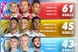 體育資訊1月24日訊 數據網站Score90盤點了本賽季五大聯賽球隊進攻三叉戟在各項賽事進球榜,具體如下:
