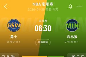 體育資訊01月25日訊 名記Shams報道,原定今日06:30進行的,森林狼主場對陣勇士的比賽被延期至26日06:30。