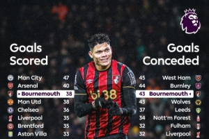 體育資訊1月25日訊 英超第23輪比賽,伯恩茅斯主場(chǎng)3-2擊敗利物浦,據(jù)英超官方統(tǒng)計(jì),伯恩茅斯本賽季英超進(jìn)球、丟球皆排在第三名。