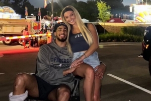 體育資訊7月5日訊 當地時間7月4日是美國獨立日,哈利伯頓和女友Jade在室外觀看煙花秀慶祝節日。