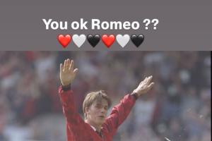 雖然貝克漢姆是曼聯名宿,但他的二兒子羅密歐則是阿森納球迷。賽后,貝克漢姆曬出自己曼聯球員時期的慶祝照@羅密歐:“你還好嗎??”