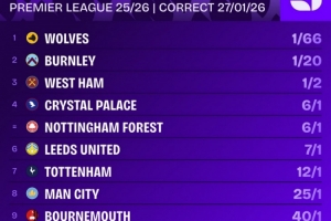 本賽季英超降級賠率排名: