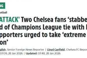體育資訊01月28日訊 切爾西客戰那不勒斯的歐冠關鍵戰賽前,切爾西發表聲明,稱2名切爾西球迷在那不勒斯受傷。據太陽報報道,兩名切爾西球迷被那不勒斯極端球迷追趕后刺傷。