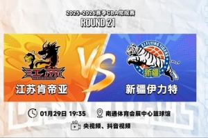 1月29日19:35,2025-26賽季CBA常規賽第二十一輪,江蘇肯帝亞將回到主場南通體育會展中心籃球館,迎來與新疆伊力特的三番戰。
