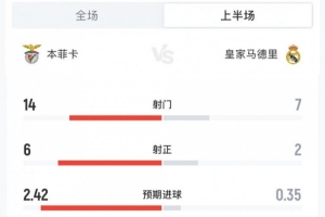 體育資訊1月29日訊 歐冠聯賽階段第8輪,本菲卡主場對陣皇馬,半場主隊2-1領先,兩隊半場數據如下(本菲卡在前):