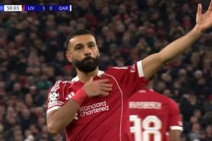 比賽第50分鐘,利物浦任意球索博斯洛伊一踩,薩拉赫左腳轟出世界波,打進非洲杯結束歸隊后首球,拍胸口利物浦隊徽慶祝!場上比分利物浦3-0卡拉巴赫。