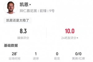 體育資訊1月29日訊 拜仁在本輪歐冠2-1力克埃因霍溫,凱恩本場數據如下:
