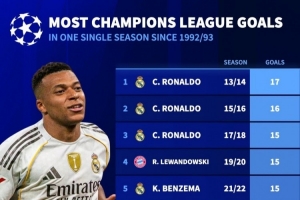 體育資訊1月29日訊 德國轉會市場統計了192-1993賽季歐冠改制以來球員單賽季進球數量,并列出榜單,13-14賽季C羅17球居首,本賽季姆巴佩13球并列第7。