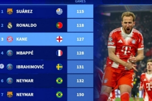 體育資訊1月29日訊 在本輪歐冠,拜仁2-1擊敗埃因霍溫,凱恩破門得分,達成拜仁生涯直接參與150球里程碑。以下為自2000年代表單一俱樂部直接參與150球最快紀錄榜,具體如下: