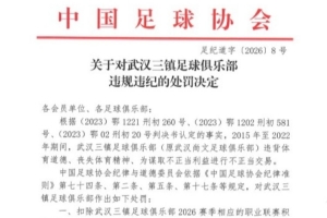 體育資訊1月29日訊 今日,中國足協公布了“假賭黑”專項整治行動武漢三鎮的出發決定,與體育資訊此前透露的信息一致,武漢三鎮被扣除2026賽季職業聯賽積分5分,并罰款人民幣80萬元。