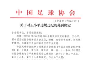體育資訊01月29日訊 中國足協公布足球行業“假賭黑”處罰決定,原中國足球協會紀律委員會主任王小平受賄,進行不正當交易,終身禁止從事任何與足球有關的活動。