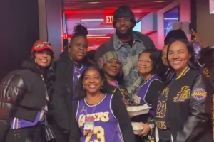 賽后,詹姆斯的一些家人們身穿他的球衣現(xiàn)身支援,詹姆斯送上合影和簽名。