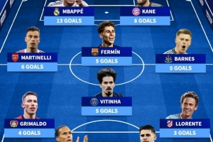 體育資訊1月29日訊 歐冠聯(lián)賽階段戰(zhàn)罷,德轉(zhuǎn)也盤點(diǎn)了本賽季進(jìn)球最多11人陣容,具體如下: